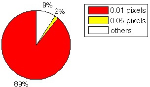 The large majority of keypoints correspond nearly exactly. The following figure shows the percentage of keypoints computed by the two implementations whose center matches with a precision of at least 0.01 pixels and 0.05 pixels respectively.