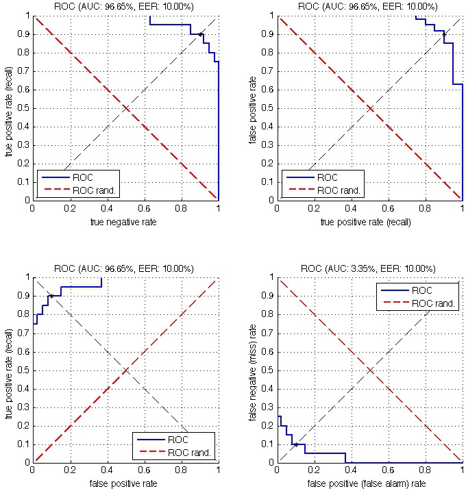 A limitation of the ROC curves in evaluating a typical retrieval system is that they put equal emphasis on false positive and false negative errors. In a tipical retrieval application, however, the vast majority of the samples are negative, so the false negative rate is typically very small for any operating point of interest. Therefore the emphasis is usually on the very first portion of the rank, where the few positive samples should concentrate. This can be emphasized by using either precision-recall plot or a variant of the ROC curves called Detection Error Tradeoff (DET) curves.